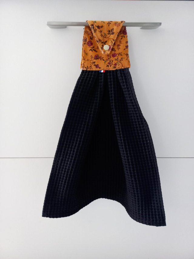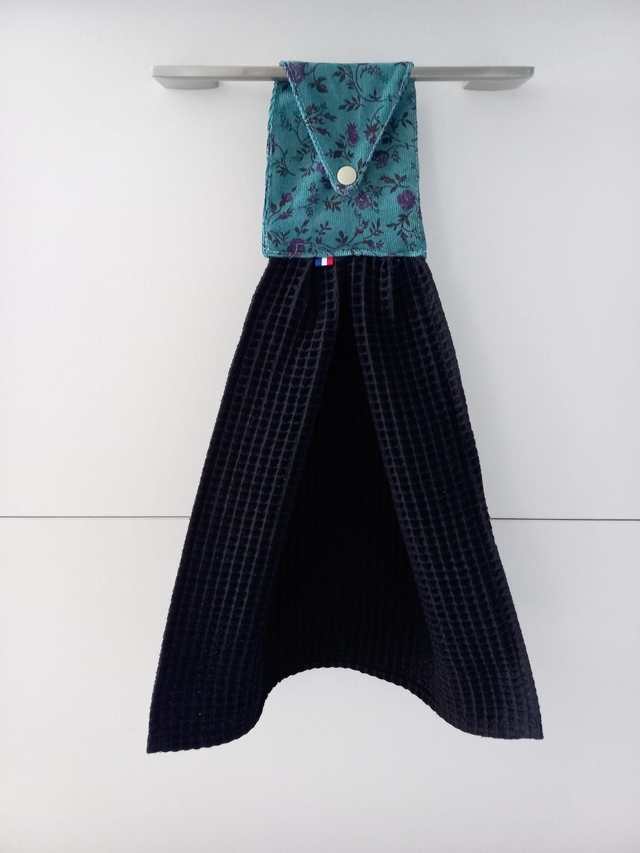 Essuie-mains réalisé en tissu éponge avec accroche en coton et pression. il sera bien utile dans votre cuisine, la salle de bain ou cabinet de toilette. il trouvera sa place accroché à la porte du four ou à une poignée de porte de placard. il est maintenu grâce à une pression.