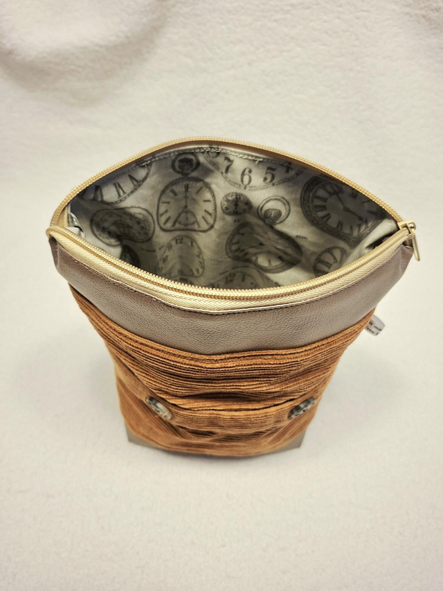 Réalisé en simili cuir avec une poche boutonnée en tissu velours côtelé tout doux pour l'extérieur et en coton enduit pour l'intérieur donc imperméable et facile d'entretien.