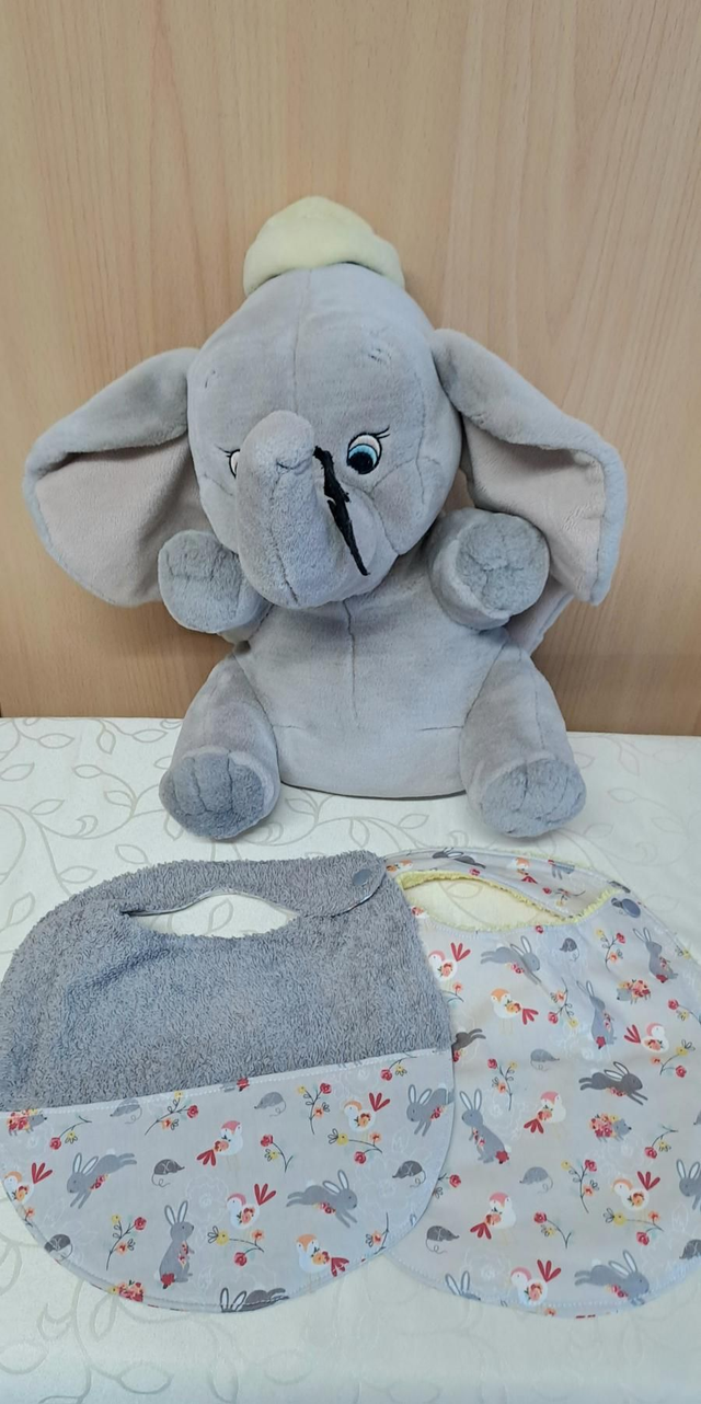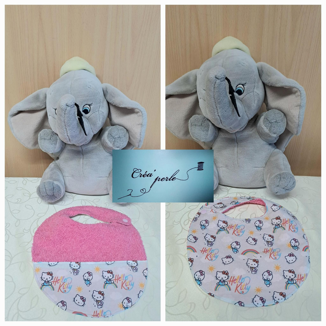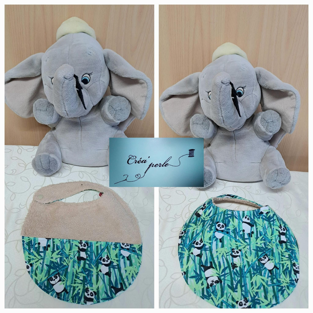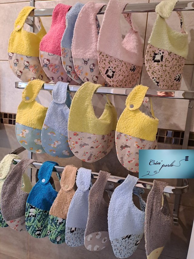 il est réalisé en tissu éponge et tissu coton imprimé, fermé par un pressions.